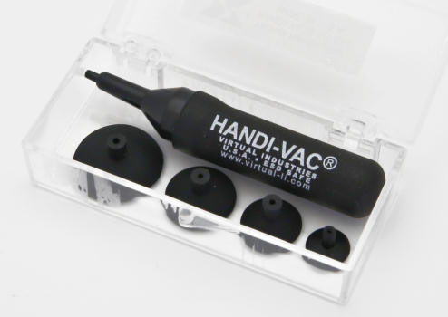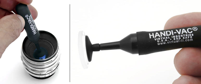 Comprei um desses sugadores para experimentar e aprovei a ferramenta. O modelo que escolhi, entre vários que encontrei em minha pesquisa, chama-se "Handi-Vac" e vem em uma prática caixa transparente com quatro ventosas em tamanhos diferentes. Basta escolher a ventosa mais adequada para a o elemento ótico que será reitrado ou recolocado, apertar sua parte superior para o vácuo fazer a ventos aderir na lente e depois puxar. Para soltar o elemento ótico basta apenas reduziir a pressão sobre seu cabo. Veja nas fotos abaixo o Handi-vac em ação.