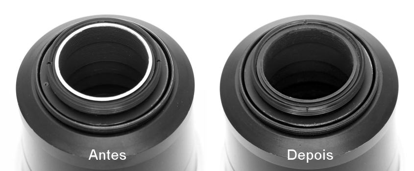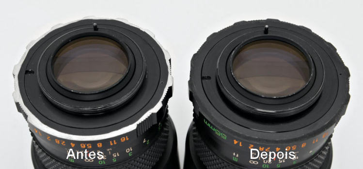 Essa anodização também pode ser usada para reparar pequenos arranhões na superfície externa do corpo das objetivas, mas apenas quando aplicadas em áreas pequenas.  Apenas alerto que esse produto gera gases tóxicos quando reage sobre a superfície de alumínio, exalando um cheiro bem desagradável, então deve-se ter o cuidado de realizar sua aplicação sempre em locais ventilados.