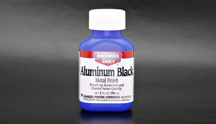 Procurei um pouco e descobri que o produto já estava à venda aqui no Brasil, inclusive no Mercado Livre, então não perdi tempo e comprei um frasco para experimentar. Fiquei surpreso com o resultado de seu uso, que além de ser rápido é extremamente simples se comparado à anodização tradicional. Veja abaixo a foto da embalagem desse anodizador chamado Aluminium Black que é fabricado pela Birchwood Casey.