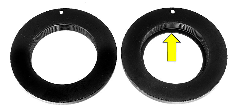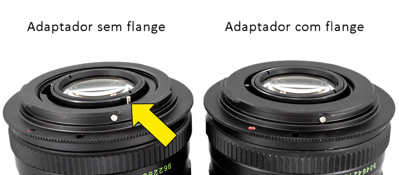 O adaptador M42 da esquerda NÃO TEM flange e o da direita TEM flange, que na foto está indicada por essa discreta seta amarela. Para ilustrar melhor, veja a seguir uma foto de duas objetivas iguais montadas com adaptadores M42 sem flange e com flange.