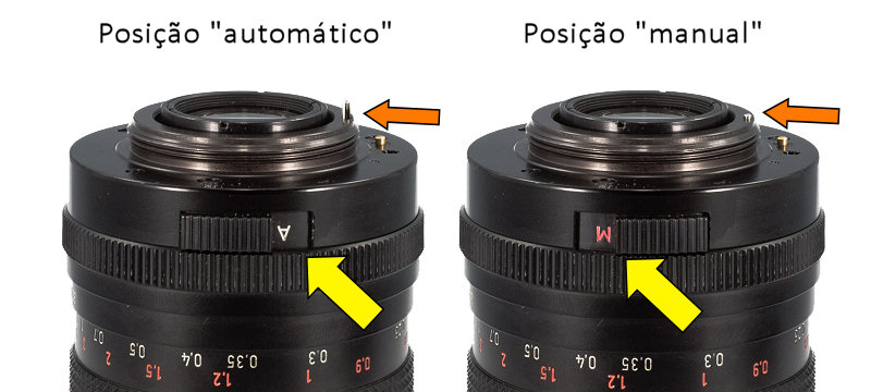 A seta amarela mostra a situação do pino de travamento do diafragma, que no caso do adaptador sem flange fica levantado, deixando inoperante o anel seletor de abertura da objetiva. Na objetiva da direita o mesmo pino está coberto e travado pelo flange do adaptador, permitindo que o anel de seleção da abertura do diafragma opere normalmente.