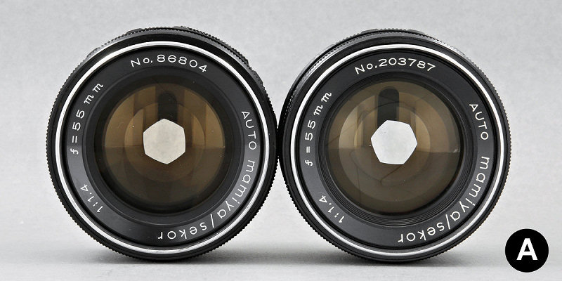 Algum tempo depois recebi outra Auto Mamiya/Sekor f/1.4 55mm e fazendo nela uma rápida revisão, percebi que ela funcionava na Canon EOS sem colidir com o espelho da câmera. Então procurei compará-la com as outras e descobri que em algum momento a Mamiya realizou uma modificação sutil no suporte da lente traseira, mas que fez toda diferença para o uso nas câmeras Canon EOS. Nessa comparação utilizei uma Mamiya que já tinha comigo (n/s 86804) com a que acabara de chegar (n/s 203787), conforme mostro na foto abaixo.