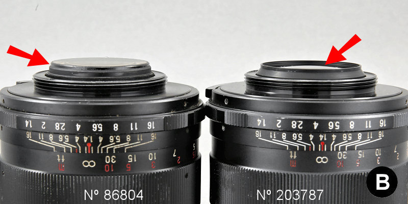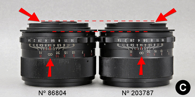 Observando a traseira das duas objetivas, verifiquei que na mais antiga (n/s 86804) o elemento traseiro está posicionado acima do limite de seu suporte metálico, porém na mais recente (n/s 203787) o elemento traseiro está posicionado abaixo do limite de seu suporte metálico, conforme pode ser verificado na foto abaixo. Imaginei que fosse uma medida de proteção contra riscos e avarias, já que no modelo mais antigos a superfície da lente ficava muito exposta.
